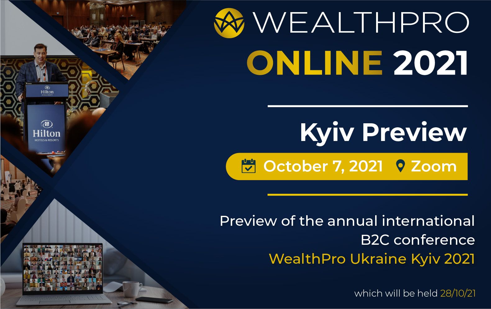 The annual international B2C conference and exhibition WealthPro Ukraine Kyiv 2021 will bring together participants and speakers around the world. It will be held on October 28, 2021 at the Hilton Kyiv. We would like to inform you that on the eve of this conference, we will hold the conference WealthPro Online 2021 - Kyiv Preview.